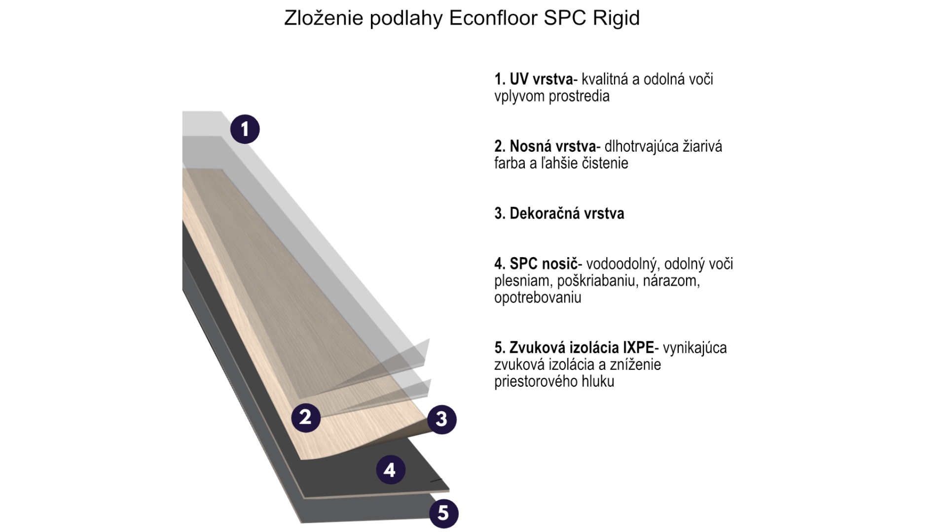 Značka ECONFLOOR predstavuje novú generáciu kompozitných vinylových podláh s pevnou nosnou doskou SPC Rigid, využívajúcu jedinečnú technológiu „Hard Systém“ pre povrchovú úpravu a vystúženie nášľapnej vrstvy. Výsledkom je tvrdší a odolnejší povrch podlahy, ktorá si tak dlho zachová svoj pekný vzhľad. Tieto podlahy sú vďaka tejto vlastnosti ideálnou voľbou aj do komerčných priestorov, ako sú obchody, kancelárske priestory, verejné priestory. Nášľapná vrstva je odolná voči každodennému zvýšenému pohybu ľudí. Skutočne praktická a štýlová podlaha s mimoriadne pevným jadrom a odolnej vrchnej vrstve odolá škvrnám, poškriabaniu, vode a nárazom.
